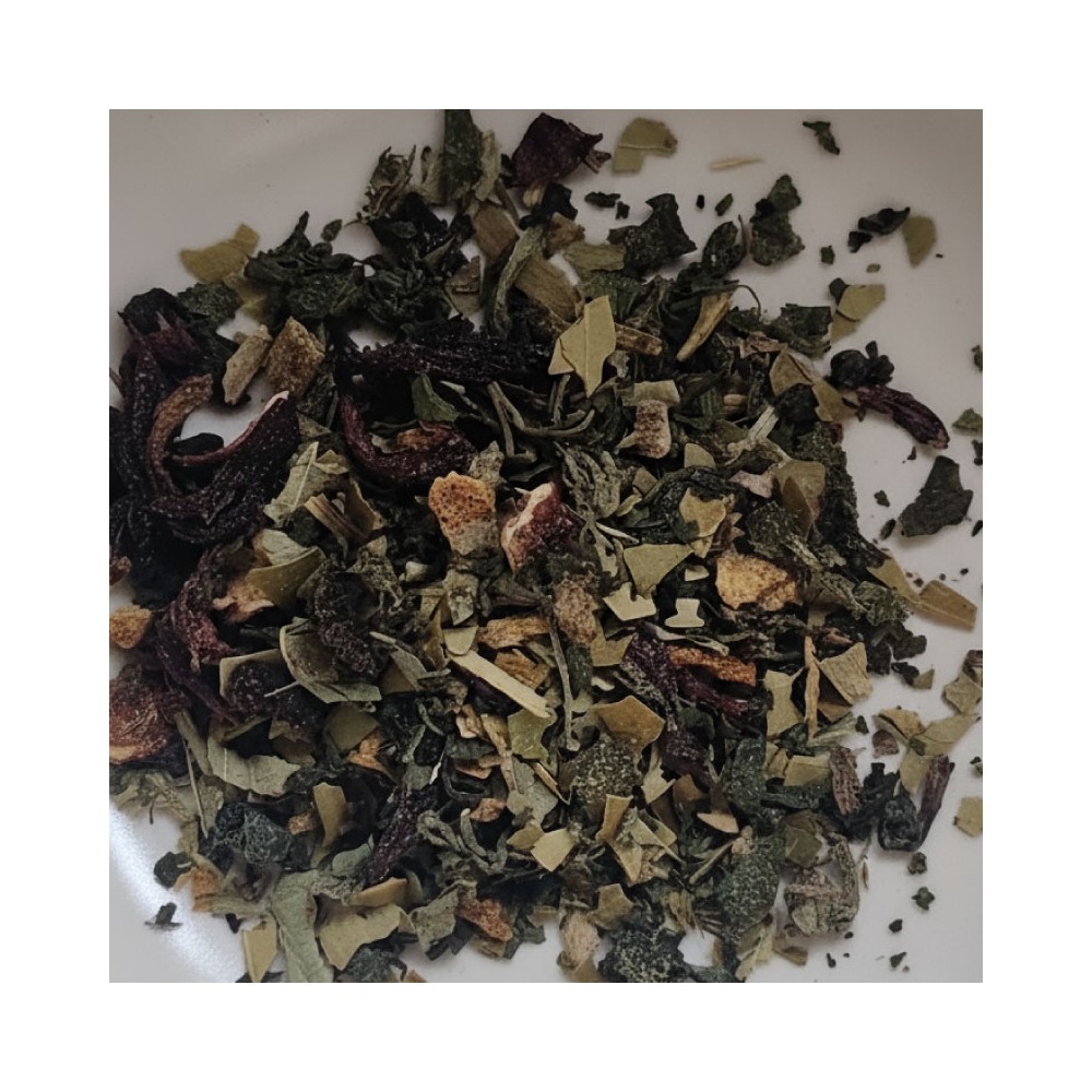 Ingrédients : Maté - Hibiscus - Thé vert -Ortie - Dent de lion - Écorce d'orange - Gingembre - Poudre d'orange/citron.