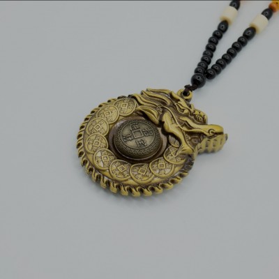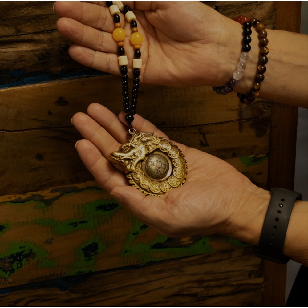 Confectionnée en laiton massif avec une finition antique finement travaillée, cette pièce se distingue par sa présence visuelle et sa forte charge symbolique. Les lignes fluides du dragon, associées aux motifs de pièces et aux caractères chinois stylisés, évoquent des bénédictions traditionnelles liées à la fortune, au succès et à la protection.